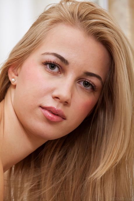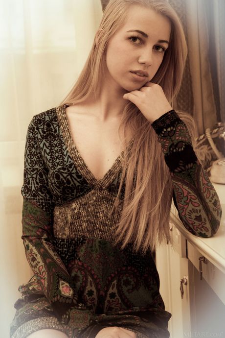 Young blonde Adagio removes her dress to pose nude without embarrassment