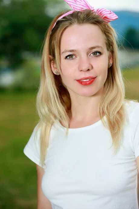 Young blonde Elisa Liv gets naked on a towel in a field