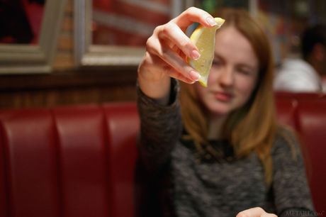 Young redhead Alice May gets naked in a pair of socks while on vacation