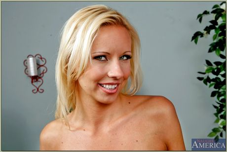 Blonde babe with tiny tits Nikki Luv strips and shows her shaved cunt