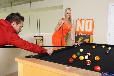 Blonde cougar Emma Starr seduces a married man in a black dress
