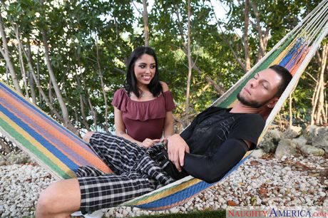 Brunette Latina Vanessa Sky has sex with a married man on a bed