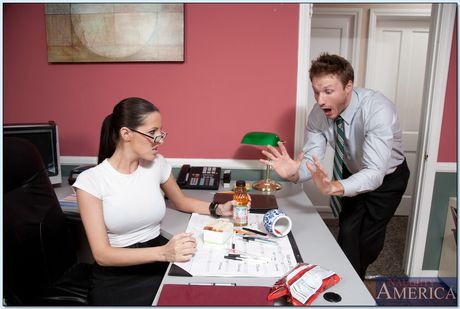 Brunette secretary Kortney Kane gets her shaved pussy fucked at work