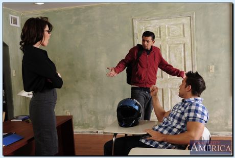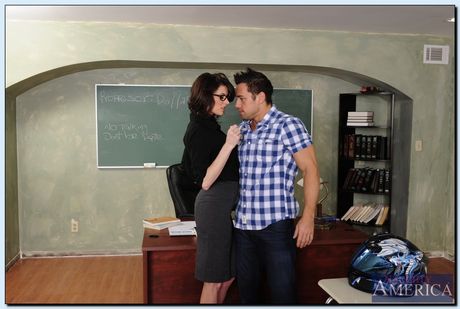 Brunette teacher Dallas seduces a student in her classroom on a chair