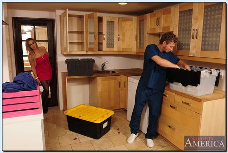 Sexy blonde Abbey Brooks strips to stockings and high heels on bed