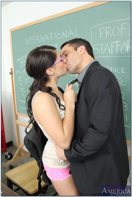 Sexy brunette coed Scarlet Banks gets her shaved pussy filled