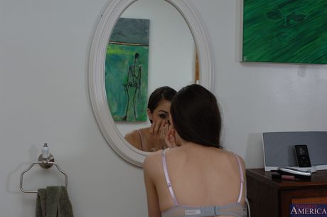 Skinny teen Sasha Grey shows her tiny tits and hairy pussy in a solo