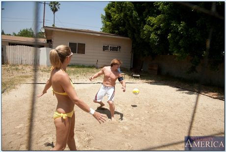 Sporty blonde babe Roxanne Hall stripping and spreading her legs