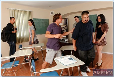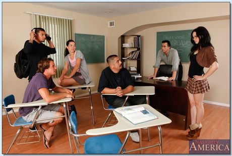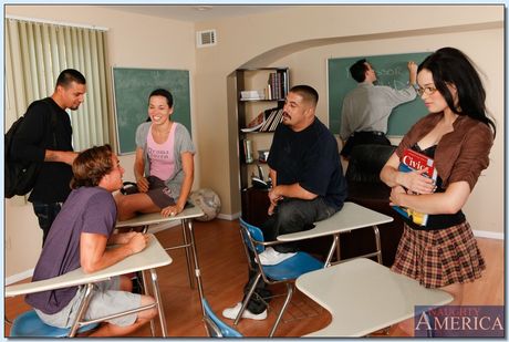 Young brunette Jenna J. Ross gets her shaved pussy fucked in class