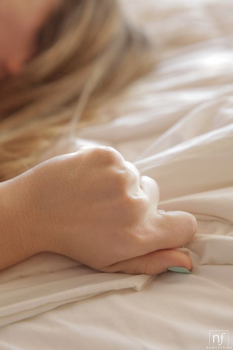 Blonde babe Alison Faye has sex with her man friend on a bed