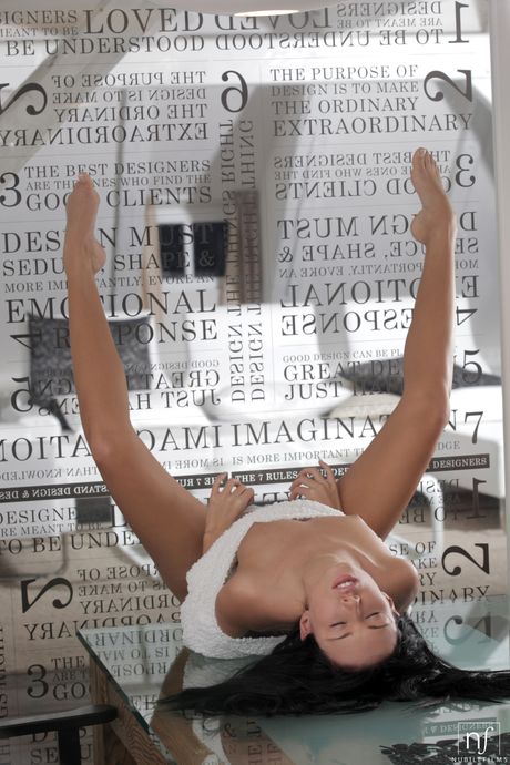 Lean teen Gina Devine masturbates after a striptease on a table