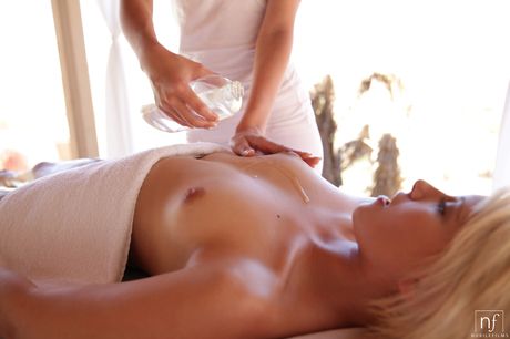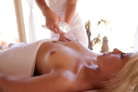 Petite lesbians Dani Desire & Sierra Nevadah have a threesome on a massage table