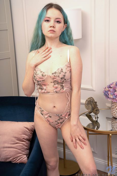 Alluring teen Rebecca Nikson strips off her lingerie before showing her pink pussy