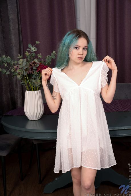 Angelic teen Rebecca Nikson strips off on a chair fearlessly