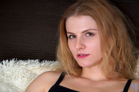 Blonde babe Fifi strips off her bra and panty set to model in the nude