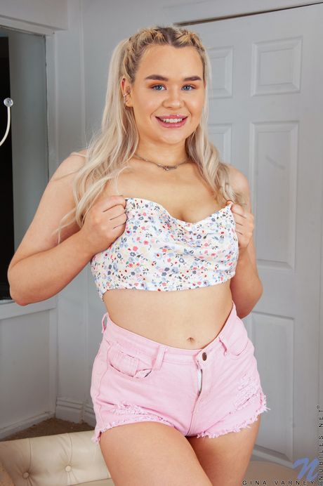 Blonde babe Gina Varney takes off her shorts before masturbating with a toy
