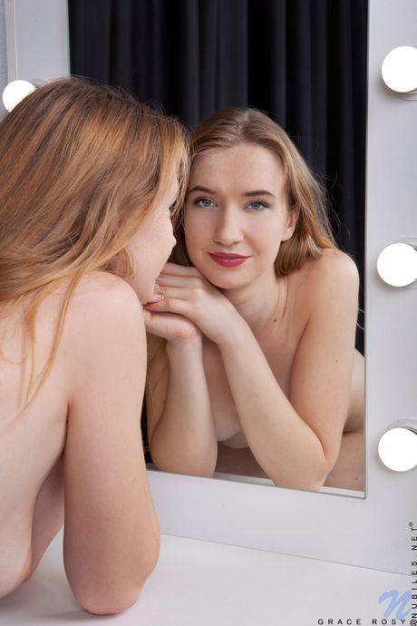Blonde babe Grace Rosy shows her small tits and shaved vagina in a solo