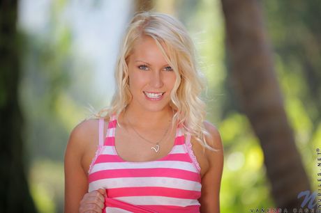 Blonde beauty Vanessa Cage removes her bra and panties before masturbating