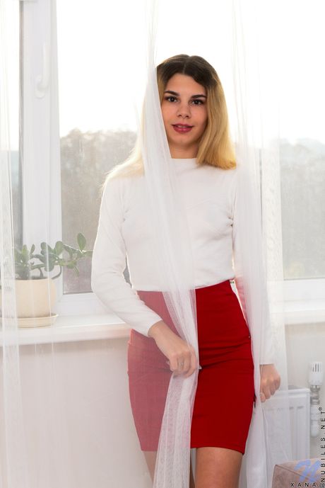 Blonde beauty Xana removes a black skirt and panties to get naked in socks