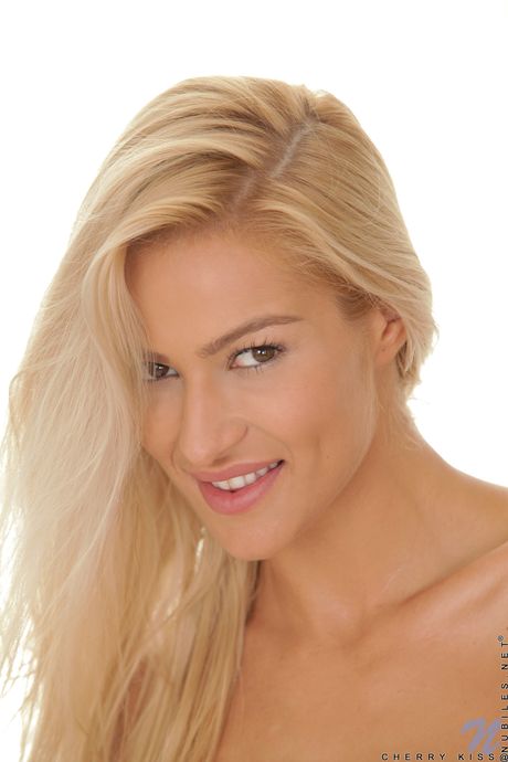 Blonde girl Cherry Kiss masturbates with a vibrator on a bed