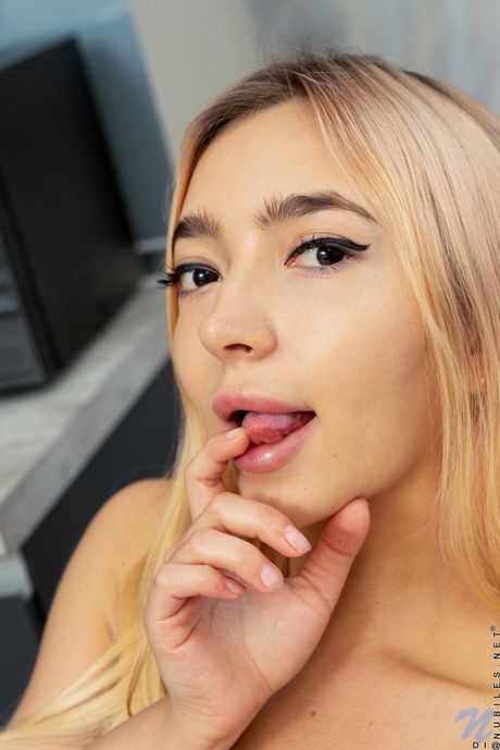 Blonde girl Di fingers her pussy after getting naked in a kitchen