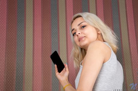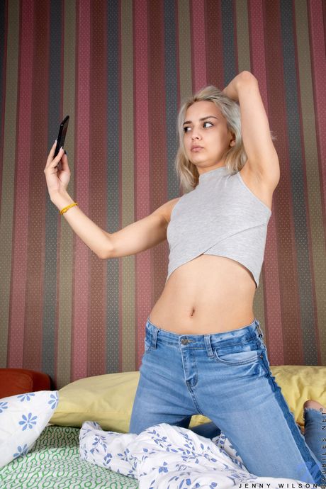 Blonde girl Jenny Wilson takes selfies while masturbating in the kitchen
