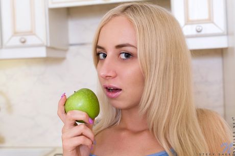 Blonde model Stefy Shee removes a black dress before showing her pink pussy