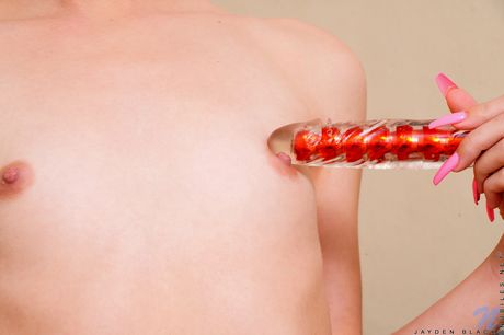 Jayden Black removes a red dress before masturbating with a glass dildo
