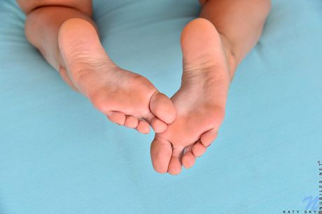 Ligh-haired teen Katy Sky takes off her bra and thong before showing her pink pussy