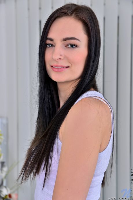 Long-haired teen Lee Anne removes a short dress to get naked on a couch