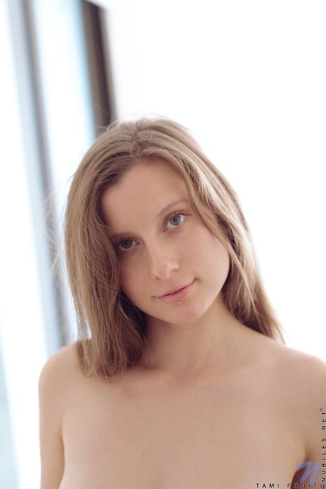 Magnetic teen Tami Fruit unveils her big tits and shaved pussy in a solo
