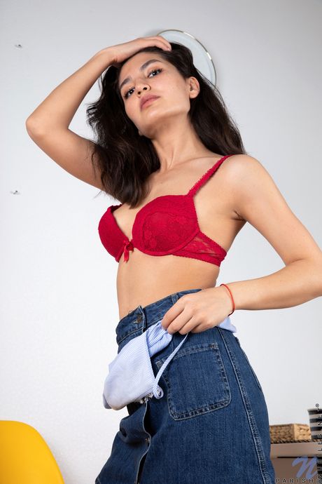 Parish slips out of her short skirt and bra to show off her puffy nipples
