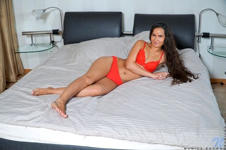 Petite teen Monica Brown fingers her pussy after removing her bra and panties
