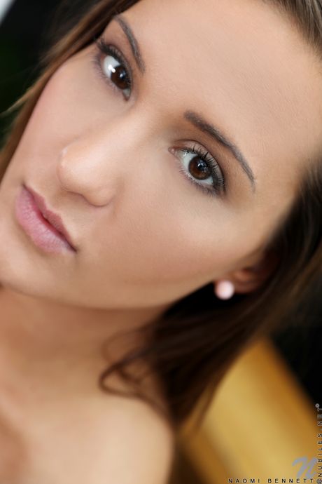 Petite teen Naomi Bennett shows her small tits and shaved pussy in a solo