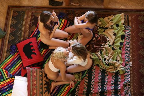 Four teen girls in socks have a lesbian sex session in a bedroom