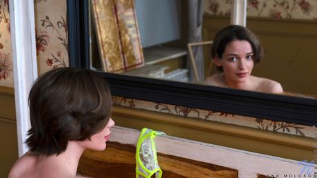 Sexy blonde Ana Moloko shows her big boobs and shaved pussy in white stockings