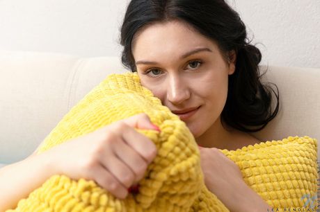 Sexy teen Lea Benolas undresses and plays with her pink pussy in a solo