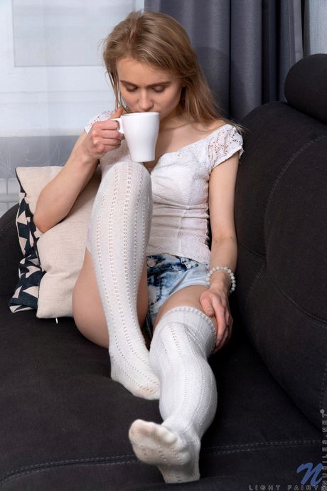 Skinny blonde Light Fairy fingers her pussy in white knee socks