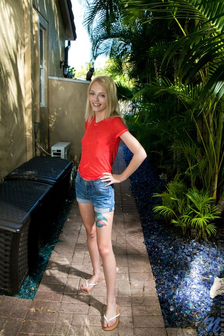 Skinny blonde teen Kate Bloom bares herself on a blanket in the backyard