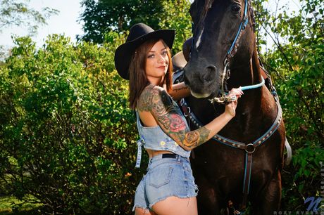 Slender teen Roxy Ryder goes naked on a horse trailer in cowgirl boots
