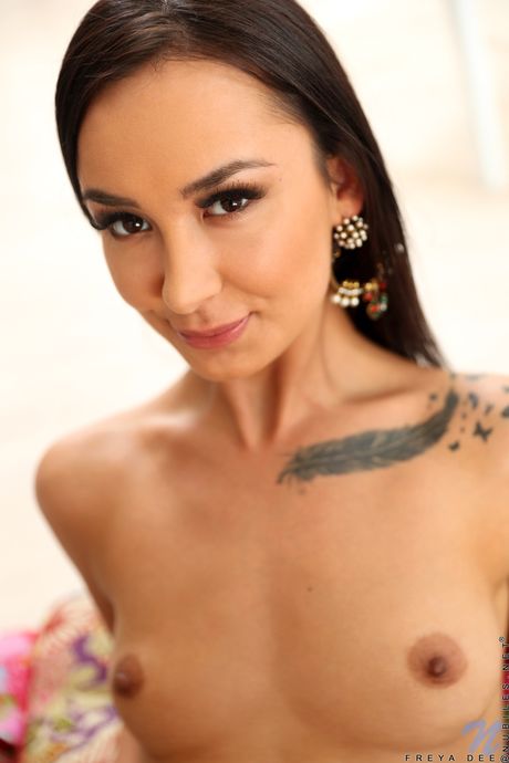 Slim teen Freya Dee strips off her jeans before masturbating on a bed