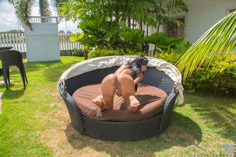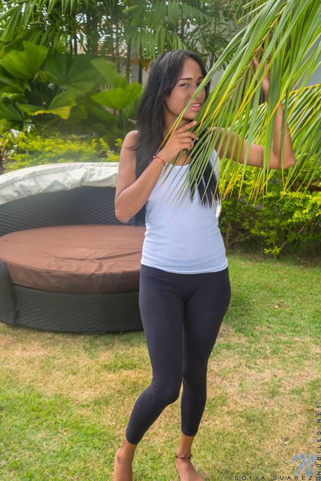 Slim teen Sofia Suarez takes off her yoga pants to pose nude on a patio