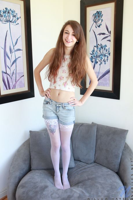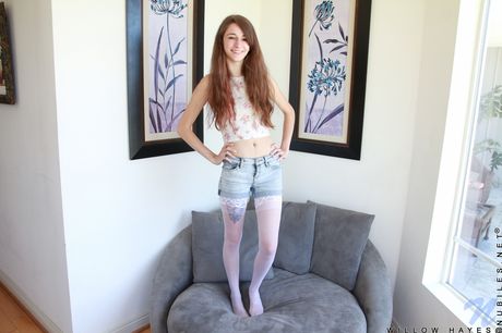 Thin teen Willow Hayes takes off her clothes before masturbating in stockings