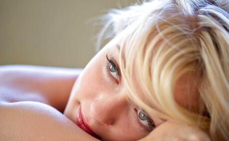 Peachy american blond Kenze Thomas exhibiting big titties and shaved pussy