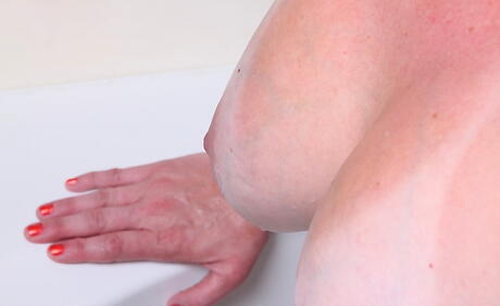 Peachy mature Lynn Miller baring big tits and hairy pussy in bathroom