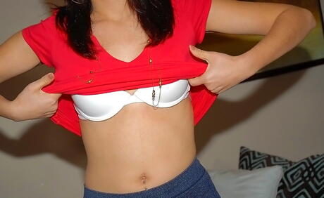 Rangy american babe Sophia Striker denudes tiny tits and bald pussy