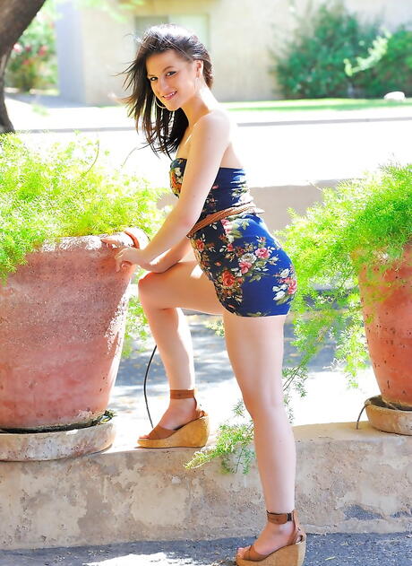 Rangy american brunette teen Aubrey Sky in skirt unveiling tiny tits and toying her cunt outdoor