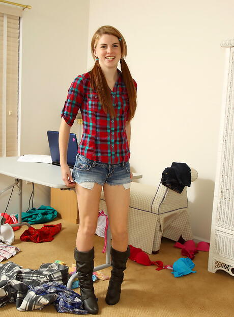Rangy american youthful Aubrey Belle in sexy shorts denudes small tits and toys her twat