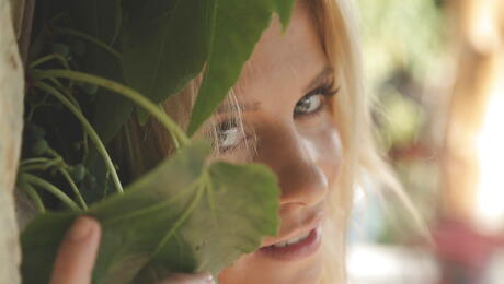 Rangy blond pornstar Leony April in hot panties uncovers small tits and spreads her legs outdoor