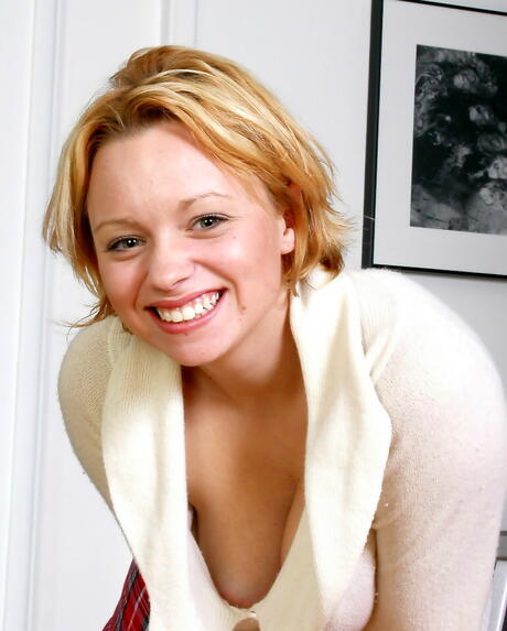 Rangy blond youthful Madison in nice skirt denudes big tits and spreads her legs
